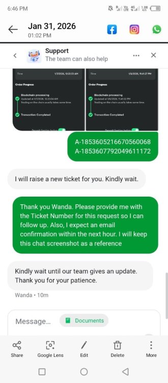 Made a withdrawal on 30th Jan 2026 shows successful but I didn't receive the money .It has been more than a week still ot credited and created a ticket that shows processing. How can I get my money back